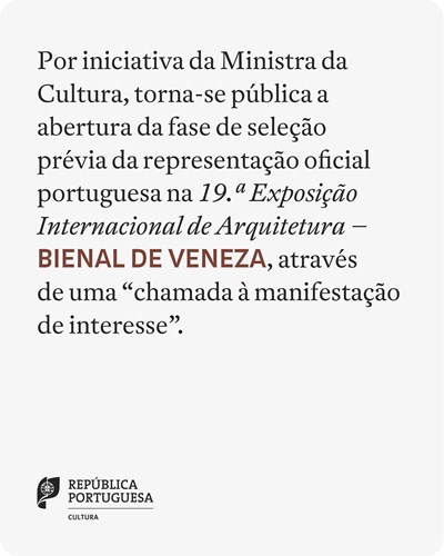 De acordo com o presente diploma: 1- Torna-se pública a abertura da fase de seleção prévia da representação oficial portuguesa na 19.ª Exposição Internacional de Arquitetura - Bienal de Veneza (Bienal de Veneza 2025). 2 - O pavilhão da representação oficial portuguesa na Bienal de Veneza 2025 está localizado na Fondaco Marcello, 30124, Calle del Tragheto, 3415, 30123, Veneza, Itália. 3 - A fase de seleção prévia é aberta a arquitetos e profissionais com ligações à área disciplinar da arquitetura.